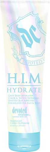 HIM Hydrate™ is formulated exclusively for the guy on the go! This fast absorbing, ultra-hydrating formula can be used after the gym, sun exposure, shower or anytime your skin needs a quench of moisture. HIM Hydrate™ is formulated with natural vitamins, antioxidants and anti-inflammatory agents to help balance all skin types while also quickly absorbing into the skin to not leave any unnecessary residue. Tattoo and color extenders work overtime to protect the ink and tan you have worked so hard to achieve. If what you seek is high quality hydration in a moisturizer formulated for Men, demand Devoted Creations new HIM Hydrate