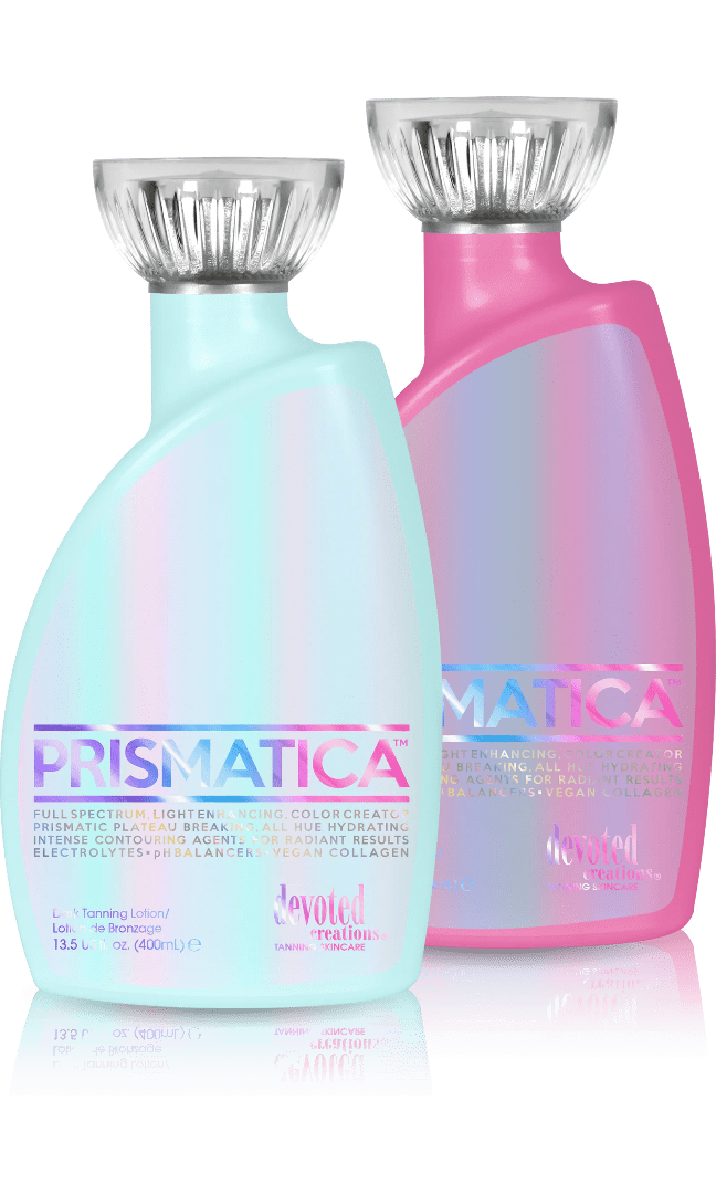 It’s time to glisten and glow with Prismatica™, the newest revolutionary innovation by Devoted Creations! This Chromatic Color Enhancing formula is designed to work with Blue light, Red light and UV light to help you achieve high intensity results! Formulated with pH balancing agents, plateau breakers and an electrolyte cocktail, Prismatica™ will penetrate quickly into the skin so you are able to receive unmatched results from every session. A rapid release blend of Vegan Collagen, Phytic Acid and Probiotics will help transform your skin so you are left with a tighter, more toned and firm youthful appearance. No need to sacrifice when it comes to your color, for radiant results from any light hue, Prismatica™ is the one for you! .