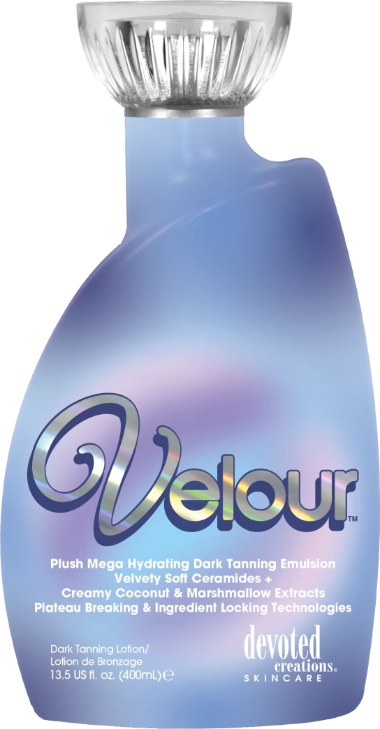 Experience the plush, velvety embrace of Devoted Creations Velour™, a luxurious lotion that cocoons your skin in silky, rich hydration. This ultra-soft, creamy formula doesn’t just deliver beautifully bronzed results – it also leaves your skin oh-so-supple and smooth! Velour’s cushiony cloud cream hugs your skin with ceramides, collagen-boosting agents, and nourishing hyaluronic acid. Soothing marshmallow and rose water antioxidants work their magic, while bakuchiol oil helps reduce the appearance of fine lines & wrinkles for a more youthful and radiant glow. Velour™ isn’t just a tanning lotion – it’s like sinking into a cloud of plush pillows and wrapping your skin in a soft, cozy glow that feels as dreamy as it looks!