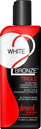 White 2 Bronze Tingle™ – you will experience a whole new level of darkness! This new tingle tanning lotion is formulated with more body heat tinglers and color boosters allowing your tan to go 3 shades darker! Higher amounts of Black Tea and Cranberry extracts will keep your skin at ample hydration levels allowing your tan to last days longer. For fast, long lasting results and ultra-hydrated more even looking color- Give your skin the treat of heat!