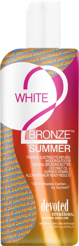 Indulge your skin in Devoted Creation’s newest tropical treat, White 2 Bronze Summer™! This indoor/outdoor streak-free/stain-free natural bronzing lotion will allow you to develop beach ready bronze results without the use of self-tanning agents! This vacation in a bottle utilizes waves of coconut oil and Cupuaçu butter so your skin is left seashore soft and smooth. Cactus water electrolytes and paradise potent vitamin C provide the skin with the essential nutrients and hydration for a sea of sunny suppleness. If what you lust is a tide of tan and bronze in a breeze, then take the plunge into the pool of color with White 2 Bronze Summer