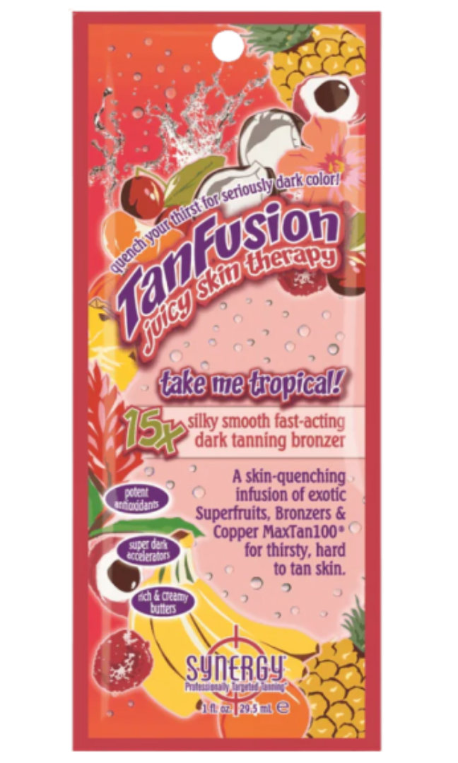 Synergy Tan Tanfusion Take Me Tropical! 15× Fast‑Acting Dark Bronzer is a powerful indoor tanning lotion that helps you achieve a rich, tropical-looking glow fast. Designed for experienced tanners, this advanced formula combines immediate bronzing agents with melanin-boosting ingredients and superfruit extracts to deliver deep colour, hydration, and silky-smooth skin.
